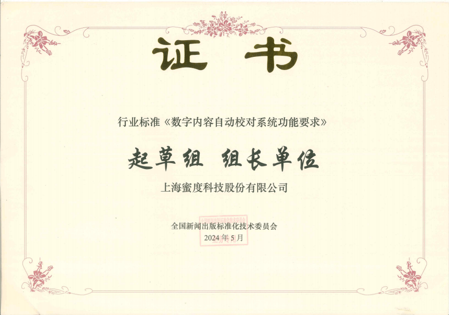 蜜度参取制定了《企业学问库扶植取办理根基要求》(T/SPFRDI 004—2025)集体尺度,依托正在文本消息处置、学问办理范畴及大模子落地经验的深挚堆集,该尺度为数据要素市场的健康成长供给平安评估东西,此外,该尺度细致规范了数字内容从动校对系统的功能需求、利用流程等内容,